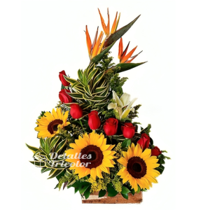 3 Girasol. Flor de complemento Margaritas. Follajes varios hojas de lino, Helecho, canción de la India. Base de vidrio. Haz tu pedido ¡YA!