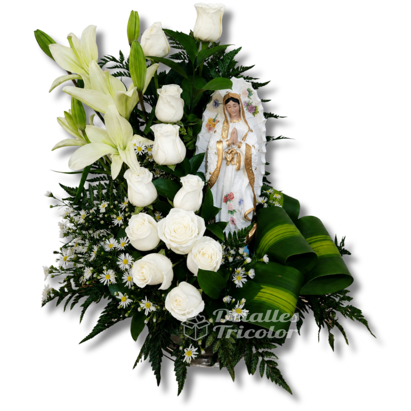 La Virgen Condolencia es un detalle fúnebre lleno de significado, ideal para transmitir apoyo, fe y acompañamiento en momentos difíciles. Este arreglo floral ha sido cuidadosamente diseñado para honrar la memoria de un ser querido y ofrecer un mensaje de serenidad a familiares y amigos. Su composición combina flores blancas de alta calidad con una delicada imagen de la Virgen, creando una presentación armoniosa, respetuosa y profundamente simbólica.